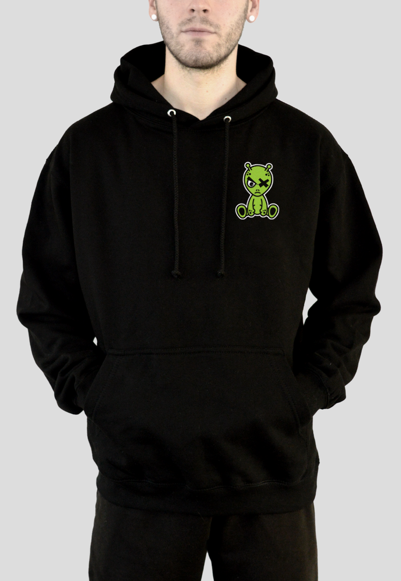 Deadly ALIEN design printed in white and green on the back and left chest of a black hoodie.