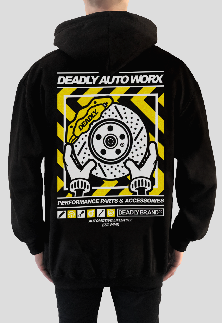 - Deadly Automotive Brake Disc design printed in yellow and white on the back and the Deadly Auto Worx logo in white on the front chest of a black hoodie.