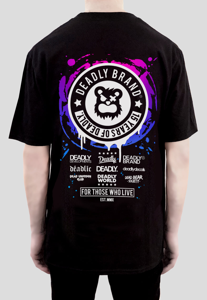 - DEADLY BRAND® Circle design and past logos from the last 15 years of our journey printed in white, pink and blue on the back of a black T-shirt.